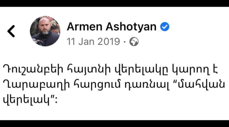 LIVEBLOG Գրեթե ամեն օր ՖԲ-ն հիշեցնում է, որ 2018-ի ապրիլից հետո ամեն հարթակում գոռում-աղաղակում էի․․․ 11.01.2021 0 min read Գրեթե ամեն օր ՖԲ-ն հիշեցնում է, որ 2018-ի ապրիլից հետո ամեն հարթակում գոռում-աղաղակում էի, որ այդ տականքը Արցախի գլխին արյունոտ ամպեր է կուտակում։ Շատերը չլսեցին։ Գոնե հիմա լսեք… Արմեն Աշոտյանի ֆեյսբուքյան էջից
