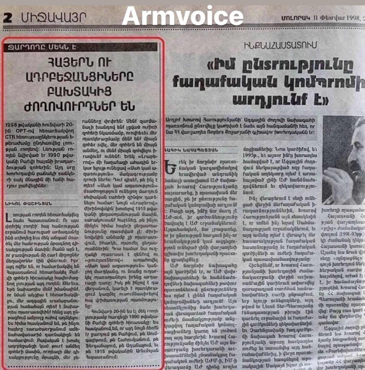 Այս տողերի հեղինակը լրագրող Նիկոլ Փաշինյանն է։ «Մոլորակ» թերթի 1998 թ․ փետրվարի 11-ի համարում հրապարակված «Հայերն ու ադրբեջանցիները բախտակից ժողովուրդներ են» վերտառությամբ հոդվածում հեղինակն անկեղծացել է՝ խոստովանելով, որ ինքն էլ է 1990 թ․հունվարի 20-ին մեկ րոպե լռությամբ հարգել Բաքվի ազերի զոհերի հիշատակը՝ գիտակցելով, որ «այդ նույն ձեռքն էր ջարդում թե՛ Բաքվում, թե՛ Սումգայիթում, թե՛ Շահումյանում, թե՛ Ֆերգանայում, թե՛ Ադանայում և թե՛ 1915 թվականին Արևմտյան Հայաստանում»։