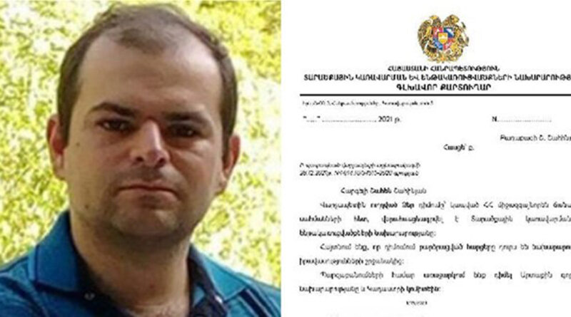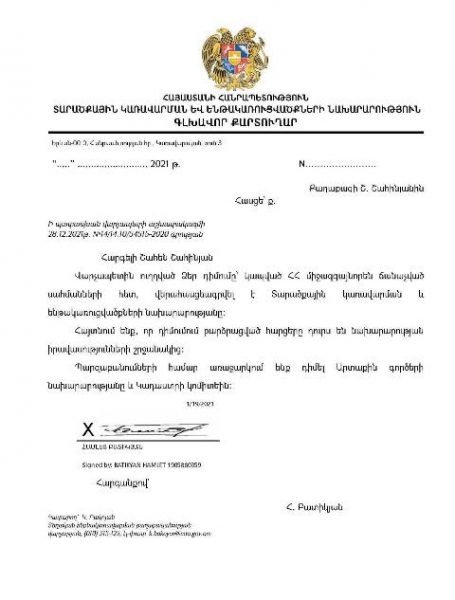 Հունվարի 19-ին ստացել է իր նամակի պատասխանը՝ վարչապետի աշխատակազմից, Տարածքային կառավարման և ենթակառուցվածքների նախարարությունից: