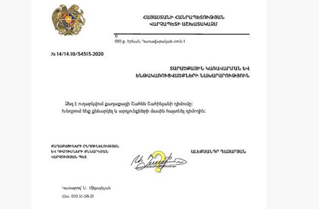 Սակայն նա չի հասկանում՝ ինչի հիման վրա է վարչապետի աշխատակազմում աշխատող Ս․ Միքայելյանի կատարմամբ և Քաղաքացիների ընդունելության և դիմումների քննարկման վարչության պետ Ալեքսանդր Ղազարյանի ստորագրությամբ գրությունը 14․01․2021թ. վերահասցեագրվել Տարածքային կառավարման և ենթակառուցվածքների նախարարություն, որ պատասխանեն: Այստեղից էլ 19․01․2021թ. պատասխանել են, որ դիմումում բարձրացված հարցերը դուրս են նախարարության իրավասությունների շրջանակից: