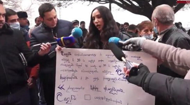 «Լրագրող Լիա Սարգսյանը կառավարության շենքի դիմաց կանգնած էր պաստառը ձեռքին։ Պաստառի վրա գրված էր մեջբերում Նիկոլ Փաշինյանի ելույթից՝ կապված Շուշիի ոչ հայկական լինելու մասին հարցադրմանը։