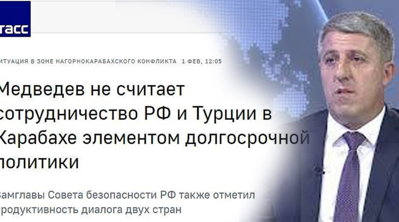 Մասնավորապես այսօր ՌԴ անվտանգության խորհրդի ղեկավարի տեղակալ Դմիտրի Մեդվեդևի՝ ռուս-թուրքական հարաբերությունների վերաբերյալ մի շարք հայտարարություններից «TACC» գործակալությունը՝ որպես իր տեղեկատվական նյութի գլխագիր, ընտրել է՝ «Մեդվեդևը ՌԴ և Թուրքիայի համագործակցությունն Արցախում [բնօրինակում՝ Ղարաբաղում] երկարաժամկետ քաղաքականության տարր չի համարում»։