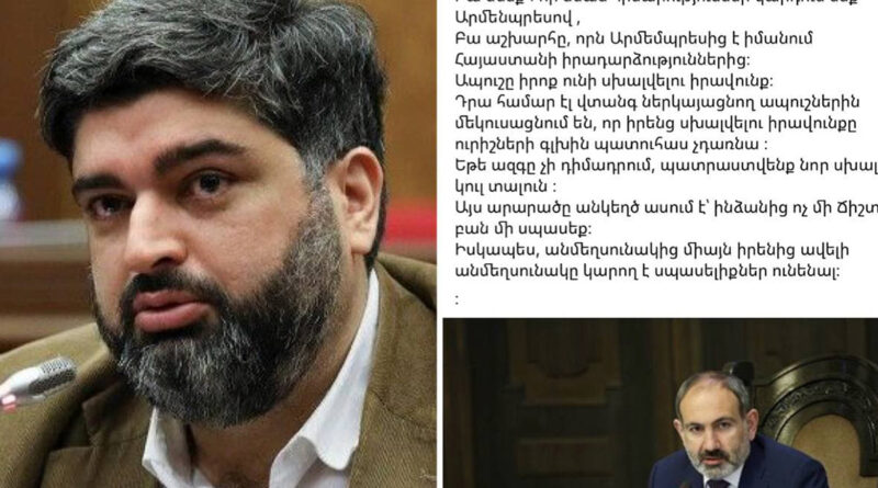 «Այս արարածը անկեղծ ասում է՝ ինձանից ոչ մի ճիշտ բան մի սպասեք։ Իսկապես, անմեղսունակից միայն իրենից ավելի անմեղսունակը կարող է սպասելիքներ ունենալ,-Նիկոլ Փաշինյանի մասին գրել է վերջինիս թիմակցի հայրը: