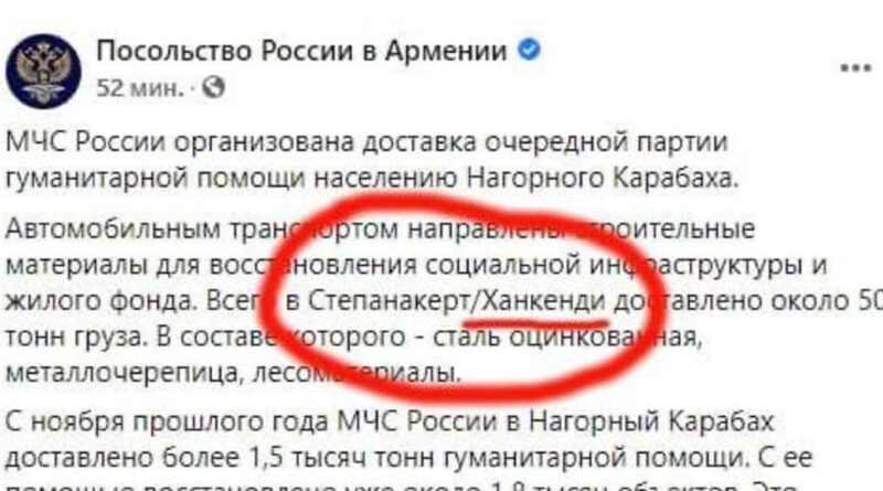 Ռուսաստանի պետական գերատեսչությունները (ԱԻՆ, ԱԳՆ) պաշտոնական հաղորդագրություններում սկսել են օգտագործել նաև Ստեփանակերտի ադրբեջանական անվանումը (Խանկենդի): Հայաստանի իշխանություններից որևէ արձագանք չկա: Նշենք, որ սա աննախադեպ երևույթ է ողջ դիվանագիտական պատմության ընթացքում: Գրում է «Մեդիապորտ» թելեգրամյան ալիքը: