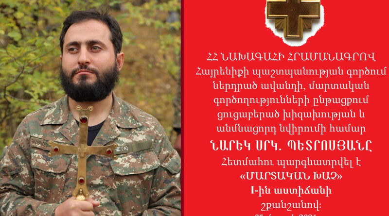 ՀՀ Նախագահի հրամանագրով Նարեկ Սրկ․ Պետրոսյանը հետմահու պարգևատրվել է «Մարտական Խաչ» առաջին աստիճանի շքանշանով