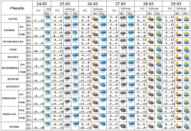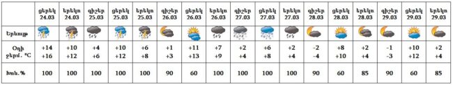 Երևան քաղաքում՝ մարտի 24-ի ցերեկը, 25-ին ժամանակ առ ժամանակ սպասվում է անձրև, հնարավոր է ամպրոպ, 26-ի երեկոյան ժամերին, 27-ին սպասվում են տեղումներ՝ բարձրադիր վայրերում ձնախառն անձրևի տեսքով։ Մարտի 26-ի գիշերը, 28-29-ը սպասվում է առանց տեղումների եղանակ: