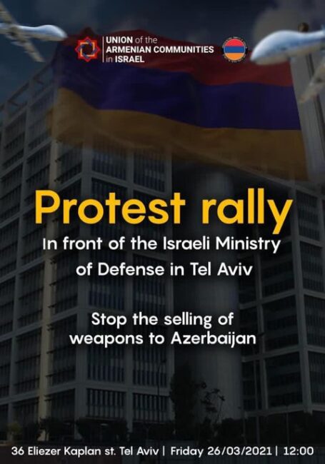 Իսրայելի հայ համայնքների միությունը մարտի 26-ին Թել -Ավիվում այդ երկրի պաշտպանության նախարարության դիմաց բողոքի ակցիա էր կազմակերպել՝ ընդդեմ Բաքվին հրեական արտադրության զենքի վաճառքի։