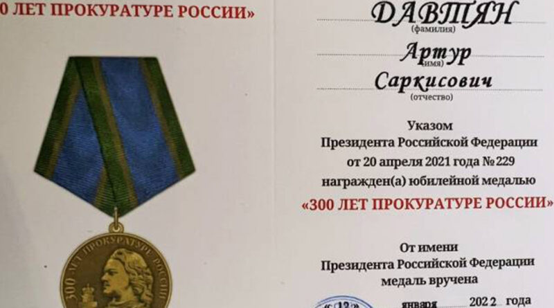 «Ռուսաստանի Դաշնության նախագահ Վլադիմիր Պուտինի 2021թ. ապրիլի 20-ի հրամանով Հայաստանի Հանրապետության գլխավոր դատախազ Արթուր Դավթյանը երկու երկրների դատախազությունների միջև արդյունավետ համագործակցության համար պարգևատրվել է «Ռուսաստանի դատախազության 300 տարին» հոբելյանական մեդալով: