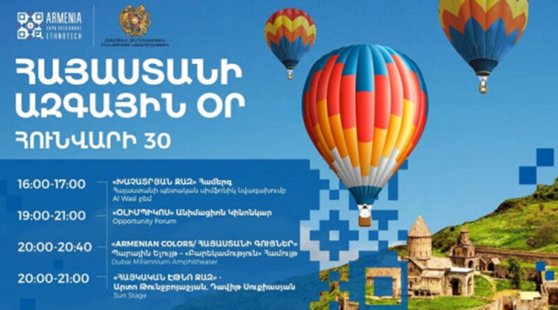 Հունվարի 30-ին «Expo 2020 Dubai» համաշխարհային ցուցահանդեսում կնշվի Հայաստանի ազգային օրը, որին նվիրված միջոցառումներին կարող եք հետևել օնլայն միացմամբ։ Այս մասին հայտնում են ՀՀ էկոնոմիկայի նախարարությունից:
