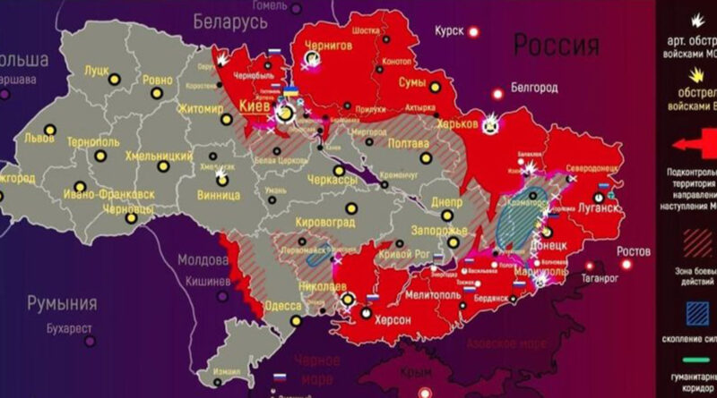 - Ուկրաինայի ԶՈւ ԳՇ տեղեկատվության համաձայն՝ ՌԴ ԶՈւ հիմնական ջանքերը կենտրոնացած են Կիևի, Խարկովի, Չերնիգովի, Սումի, Մարիուպոլի, Նիկոլաևի ուղղությունների վրա: Կիևի ուղղությամբ ընթանում է Վիշգորոդի վրա հարձակման նախապատրաստում։ Զապորոժյեի ուղղությամբ ընթանում է հարձակման նպատակով վերախմբավորում, Մելիտոպոլի օդանավակայանում թռիչքուղու վերականգնում: