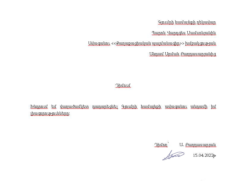 «Որպեսզի զերծ մնանք տարբեր շահարկումներից, չբանալով շատ փակագծեր, ներկայացնեմ ձեզ իմ դիմումների ընդհանուր պատճառը։