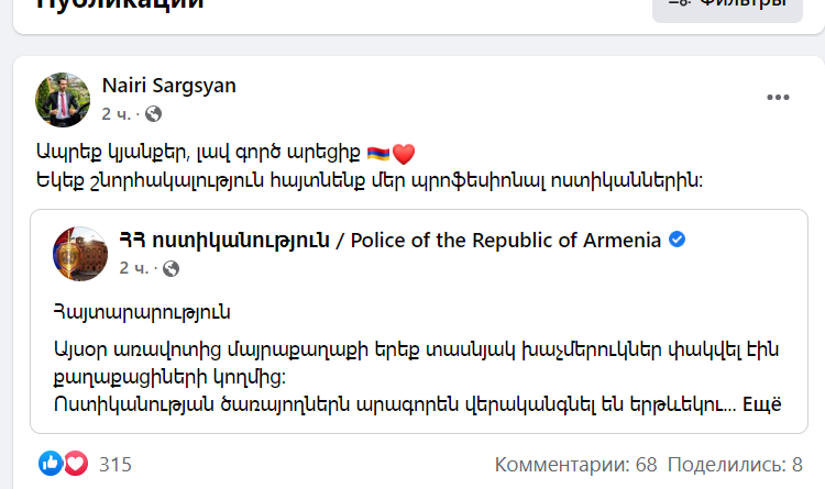 Նիկոլ Փաշինյանի նախկին օգնական Նաիրի Սարգսյանը, ոգևորված ոստիկանության այսօրվա անօրինական, բռի և բռնի գործողություններով ու անվայելուչ պահվածքով, ֆեյսբուքյան իր էջում ողջունել է նրանց և սիրո խոստովանություն արել համայն ոստիկանությանը՝ նրանց անվանելով կյանքեր։ «Ապրեք, կյանքեր, լավ գործ արեցիք։ Եկեք շնորհակալություն հայտնենք մեր պրոֆեսիոնալ ոստիկաններին»։ Փաստորեն սույն անձնավորության համար իր երկրի քաղաքացու նկատմամբ բռնություն գործադրելը, իր երկրի օրենքների վրա թքելն ու դրանք շրջանցելը բարձր պրոֆեսիոնալիզմի դրսևորում է, մի բան, ինչով արդեն չորս տարի շարունակ զբաղված է իր համակրած քպ-ական թիմը՝ երկիրը կործանման առաջ կանգնեցրած Նիկոլ Փաշինյանի գլխավորությամբ։ Այնքան «պրոֆեսիոնալ» են, որ այսօր պետական կառավարման բոլոր ինստիտուտները կաթվածահար են և միակ աշխատող կառույցները իրավապահ համակարգում են, այն էլ զուտ մեկ հոգու հլուհնազանդ ծառայելու, նրա հրահանգներն աներկբա կատարելու և նրա կյանքը պահպանելու համար, և ոչ թե պետության ու ժողովրդի անվտանգությունն ապահովելու։ Ահա, թե ինչ արժեքների կրող են իրականում նրանք, որոնք 2018 թվականին նույն ջանասիրությամբ քննադատում էին իրենց բերման ենթարկող ոստիկաններին և խոսում ժողովրդավարության, մարդու իրավունքների, ոստիկանական համակարգի բարեփոխման մասին։ Փուչիկը վաղուց է պայթել՝ մերկացնելով այս «նոր հայերի» դեմքը։