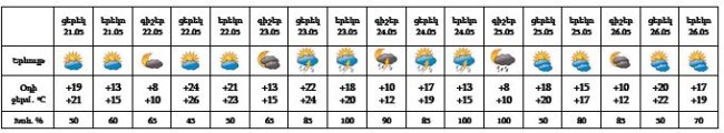 Մայիսի 21-ի ցերեկը, 22-ին, 23-ի գիշերը, 25-ի ցերեկը, 26-ին սպասվում է առանց տեղումների եղանակ: Մայիսի 23-ի ցերեկը, 24-ին, 25-ի գիշերը ժամանակ առ ժամանակ սպասվում է անձրև և ամպրոպ, ամպրոպի ժամանակ քամու ուժգնացում՝ 15-18 մ/վ: