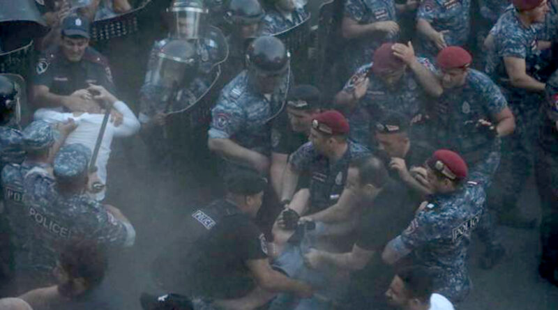 ժամը 20։30-ին հավաքի ղեկավարը՝ «Հայաստան» դաշինքի պատգամավոր Ի․ Սաղաթելյանը հայտարարեց, որ երթը շարունակվելու է Դեմիրճյան փողոցով, որը այդ պահին արգելափակված էր ոստիկանության բազմաշարք շղթայով։ Ոստիկանների մի մասը սպառազինված էին վահաններով, սաղավարտներով և մահակներով։ Հավաքի վայրում ծառայություն իրականացնող ոստիկաններից շատերը տեսանելի կերպով կամ առհասարակ չէին կրում տարբերանշաններ։ Հավաքի վայրում, ենթադրաբար, ներկա էին համազգեստ չկրող ոստիկաններ։