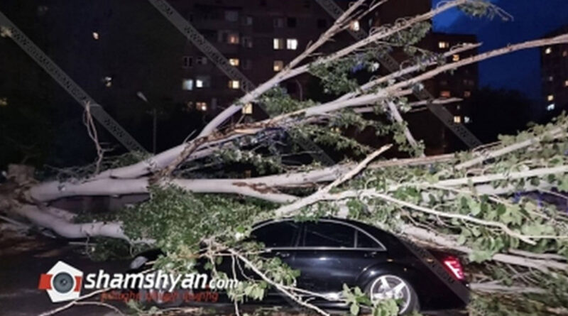 Երևանում` Նար-Դոսի անվան դպրոցի դիմաց բարդին արմատից պոկվել ու տապալվել է, վնասելով մի քանի ավտոմեքենա