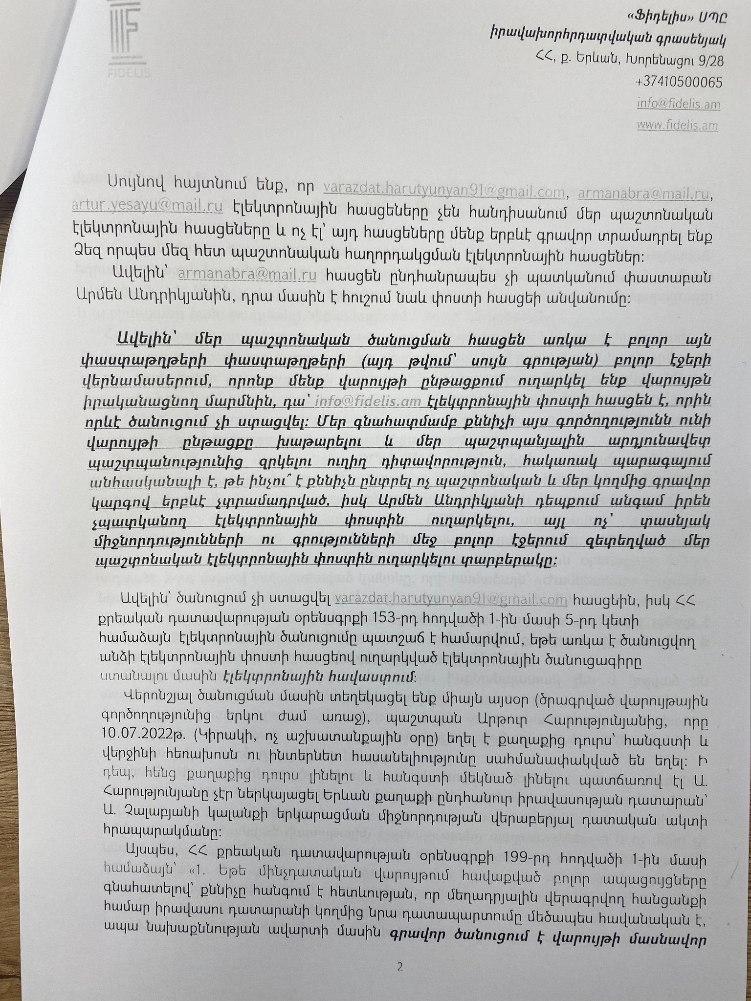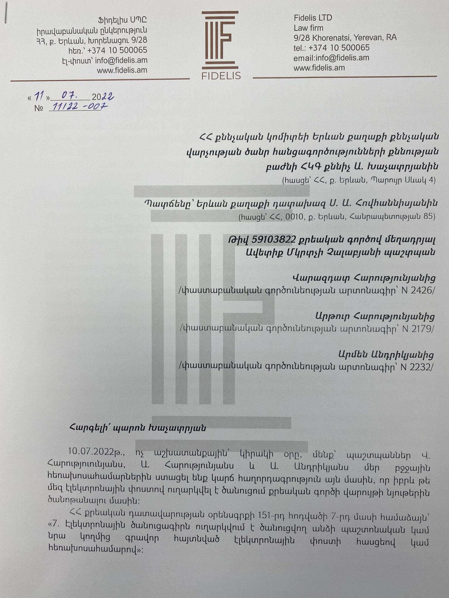 Ստորև քննիչին և Երևան քաղաքի դատախազին ուղղված մեր գրության լուսապատճենը՝ իրավական և փաստական բոլոր հիմնավորումներով։