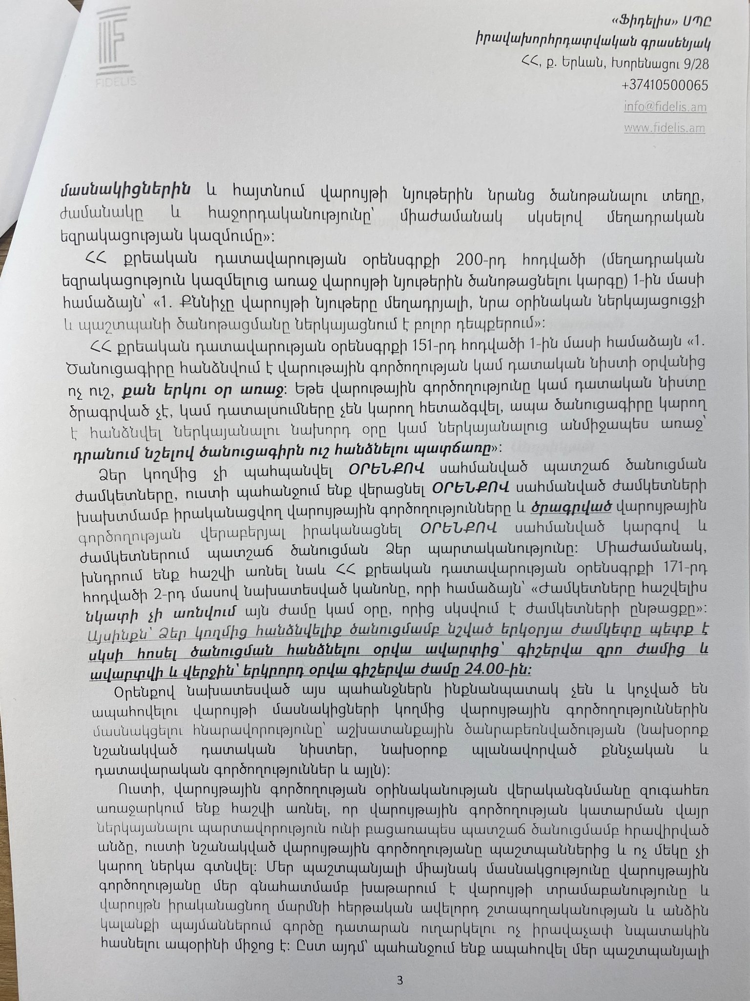 Այդ նույն թաքնված նպատակից ելնելով՝ երեկ քննիչը, կոպտորեն խախտելով ՀՀ քրեական դատավարության օրենսգրքով նախատեսված պատշաճ ծանուցման կարգն ու ժամկտները, ուղարկել է ծանուցում առ այն, որ այսօր՝ 12։00-ին “Արմավիր” ՔԿՀ-ում իրականացնելու է վարույթային գործողություն՝ գործի նյութերի ծանոթացում։