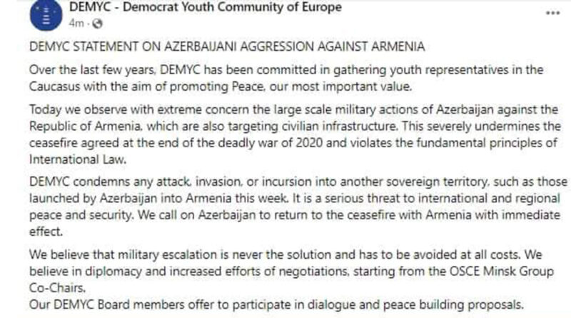 «Եվրոպայի ժողովրդավարական երիտասարդական համայնք» (DEMYC) միջազգային կառույցի հայտարարությունը Հայաստանի դեմ Ադրբեջանի ագրեսիայի վերաբերյալ