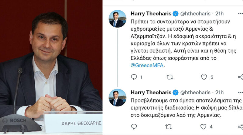«Նոր ժողովրդավարություն» կուսակցության պատգամավոր Խարիս Թեոխարիսը հայտարարել է, որ Հայաստանի ու Ադրբեջանի միջև ռազմական գործողությունները պետք է հնարավորինս շուտ դադարեցվեն: Այս մասին տեղեկացրել է Հունաստանում ՀՀ դեսպանատունը։ «Պետք է հարգել բոլոր պետությունների տարածքային ամբողջականությունն ու ինքնիշխանությունը: Սա նաև Հունաստանի դիրքորոշումն է, ինչպես որ հայտնել է Հունաստանի ԱԳ նախարարությունը:
