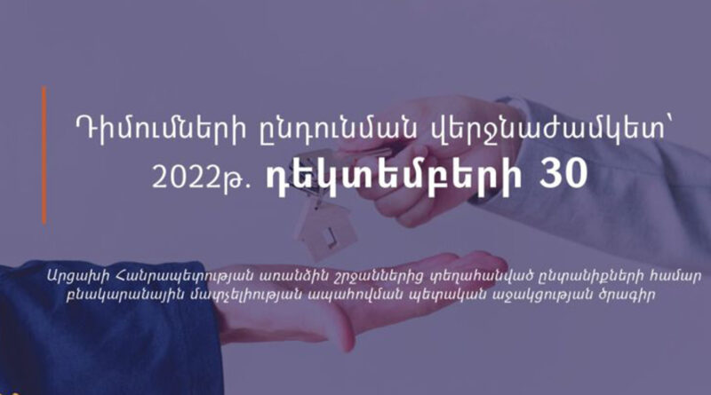 Արցախի Հանրապետության առանձին շրջաններից տեղահանված ընտանիքների համար բնակարանային մատչելիության ապահովման պետական աջակցության ծրագրի շրջանակում դիմումների ընդունման վերջնաժամկետը 2022 թվականի դեկտեմբերի 30-ն է։