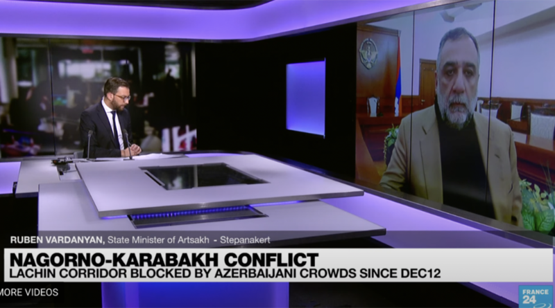 Արցախի Հանրապետության պետական նախարար Ռուբեն Վարդանյանն այսօր հեղինակավոր France 24 հեռուստաընկերության ուղիղ եթերում ներկայացրել է Ադրբեջանի կողմից Արցախի շրջափակման հետևանքով ստեղծված իրավիճակը և խոսել շրջափակման պատճառների մասին.