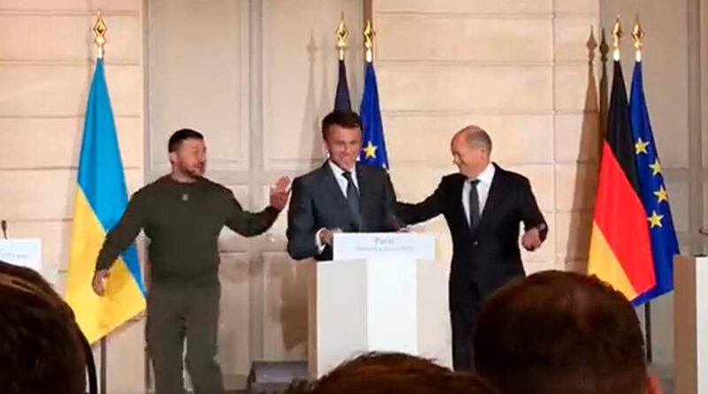 Փետրվարի 8-ին Ելիսեյան պալատում կայացած մամուլի ասուլիսի ժամանակ Գերմանիայի կանցլեր Օլաֆ Շոլցը և Ուկրաինայի նախագահ Վլադիմիր Զելենսկին խառնել են իրենց երկրների դրոշները։ Գրում է «Իզվեստիան»: