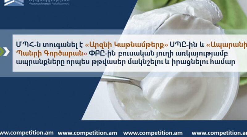 Մրցակցության պաշտպանության հանձնաժողովը հասարակության մոլորեցման դրսևորումներով անբարեխիղճ մրցակցության համար պատասխանատվության միջոցներ է կիրառել «Արզնի Կաթնամթերք» ՍՊԸ-ի և «Ապարանի Պանրի Գործարան» ՓԲԸ-ի կողմից արտադրված բուսական յուղի առկայությամբ ապրանքները որպես թթվասեր մակնշելու և իրացնելու համար։