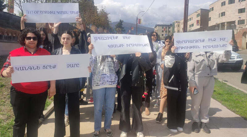 Նրանք հայերենով, ռուսերենով եւ անգլերենով վանկարկում են. «Ապահովեք մեր ազատ տեղաշարժվելու իրավունքը», «Բացեք Լաչինի միջանցքը», «Արցախի հայկականությունն այլընտրանք չունի»: