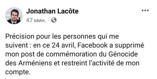 Այսօր Facebook սոցիալական ցանցը հեռացրել է Հայաստանում Ֆրանսիայի նախկին դեսպան Ջոնաթան Լաքոթի՝ Հայոց ցեղասպանության հիշատակին նվիրված գրառումը։