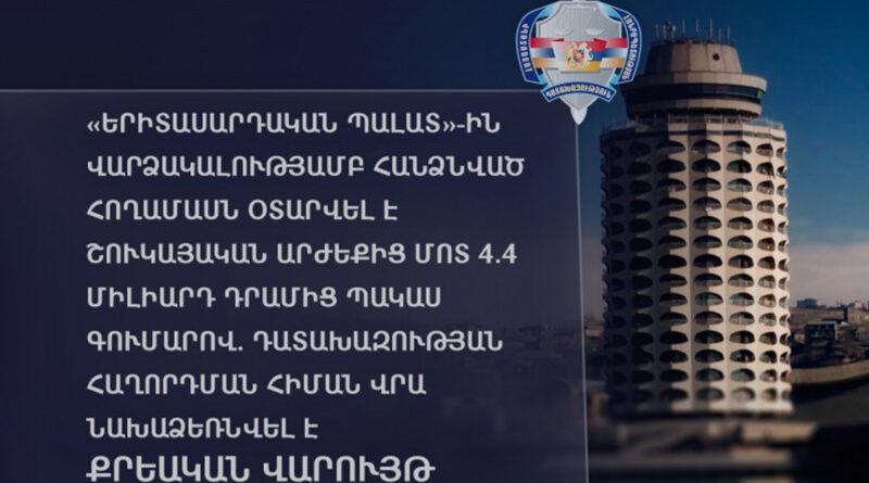 «Երիտասարդական պալատ»-ին վարձակալությամբ հանձնված հողամասն օտարվել է շուկայական արժեքից մոտ 4.4 միլիարդ դրամով պակաս. Դատախազության հաղորդման հիման վրա նախաձեռնվել է քրեական վարույթ։ Այս մասին հայտնում են գլխավոր դատախազությունից։