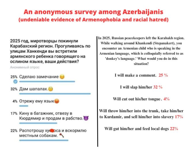 Արցախի մարդու իրավունքների պաշտպան Գեղամ Ստեփանյանը թվիթերյան իր միկրոբլոգում ներկայացրել է Ադրբեջանում անցկացված հարցման արդյունքները։ Տեղացիներից հետաքրքրվել էին, թե 2025 թվականին՝ Արցախից ռուս խաղաղապահների հեռանալուց հետո, հայ երեխայի հանդիպելիս ինչ կանեն։ Հարցման մասնակիցների 17 տոկոսը ասել է, որ երեխային գերության կվաճառի, 22 տոկոսը՝ երեխային կացնով մասերի կբաժանի ու կկերակրի շներին։