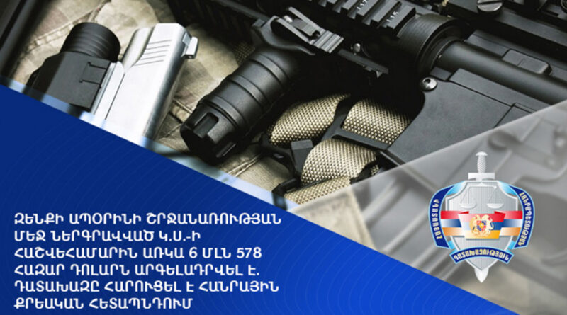 Զենքի ապօրինի շրջանառության մեջ ներգրավված Կ.Ս.-ի հաշվեհամարին առկա 6 մլն 578 000 դոլարն արգելադրվել է. դատախազություն