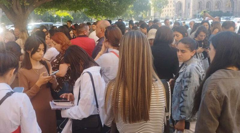 Կառավարության շենքի դիմաց հանուն Արցախի բողոքի ակցիա իրականացնող քաղաքացիները վանկարկում են՝ հայեր միացեք։