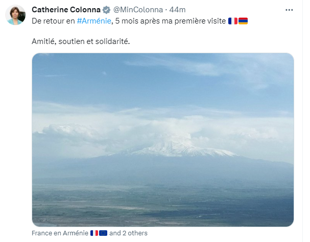 Հայաստանի հետ հարաբերությունների կարգավորման հարցով Թուրքիայի հատուկ ներկայացուցիչ Սերդար Քըլըչն արձագանքել է Ֆրանսիայի արտգործնախարար Կատրին Կոլոննայի՝ երեկ Х սոցկայքում արած հրապարակմանը, որում նա հայտնել էր Հայաստան ժամանելու մասին և հրապարակել էր Արարատ լեռան լուսանկարը: