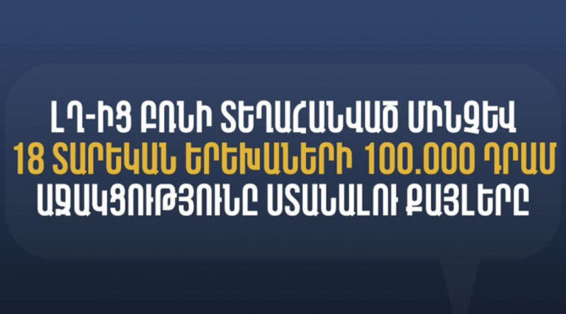 ԼՂ-ից բռնի տեղահանված, մինչև 18 տարեկան անչափահասների համար նախատեսված 100 հազար դրամ միանվագ աջակցությունն ստանալու քայլերի հաջորդականությունը՝