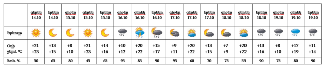 Հոկտեմբերի 14-ի ցերեկը, 15-ին, 17-ին սպասվում է առանց տեղումների եղանակ։ Հոկտեմբերի 16-ին, 18-ի երեկոյան ժամերից, 19-ին սպասվում է կարճատև անձրև և ամպրոպ։