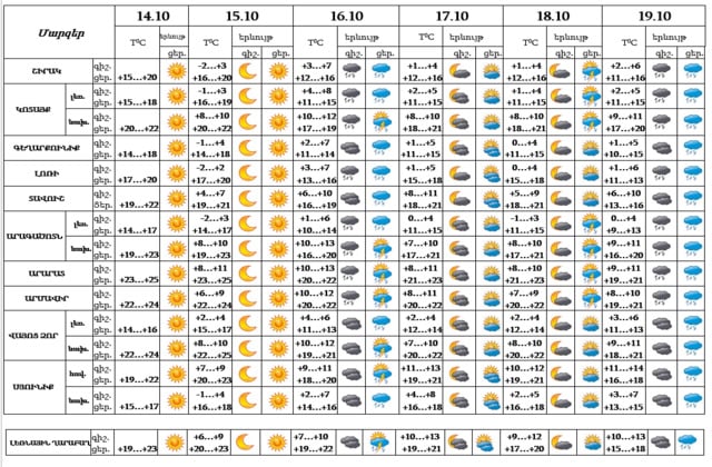 Հոկտեմբերի 14-ի ցերեկը, 15-ին, 17-ին սպասվում է առանց տեղումների եղանակ։ Հոկտեմբերի 18-ի երեկոյան ժամերին առանձին շրջաններում, 16-ին, 19-ին շրջանների զգալի մասում սպասվում է կարճատև անձրև, առանձին շրջաններում նաև ամպրոպ։ Քամին՝ հարավարևմտյան 2-5 մ/վրկ: Օդի ջերմաստիճանը հոկտեմբերի, 16-ի ցերեկը կնվազի 2-4 աստիճանով։