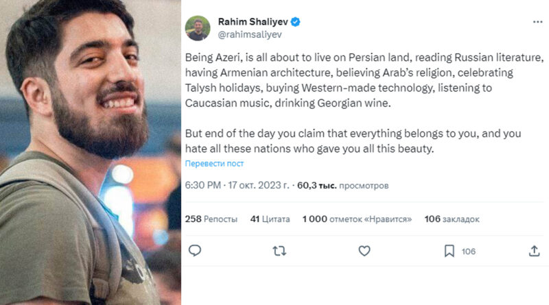 «Լինել ադրբեջանցի՝ նշանակում է ապրել պարսկական հողում, կարդալ ռուսական գրականություն, ունենալ հայկական ճարտարապետություն, դավանել արաբական կրոն, նշել թալիշական տոները, գնել արևմտյան տեխնիկա, լսել կովկասյան երաժշտություն, խմել վրացական գինի,- թվիթերյան միկրոբլոգում գրել է ազգությամբ թալիշ ադրբեջանցի լրագրող Ռահիմ Շալիևը: