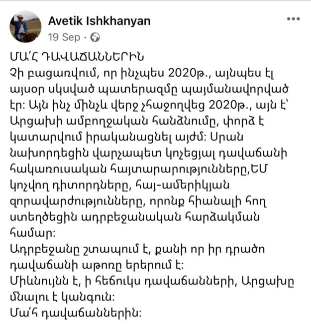 «Իրավապաշտպան Ավետիք Իշխանյանի նկատմամբ քրեական հետապնդում է հարուցվել ներքևում նշված գրառման համար։