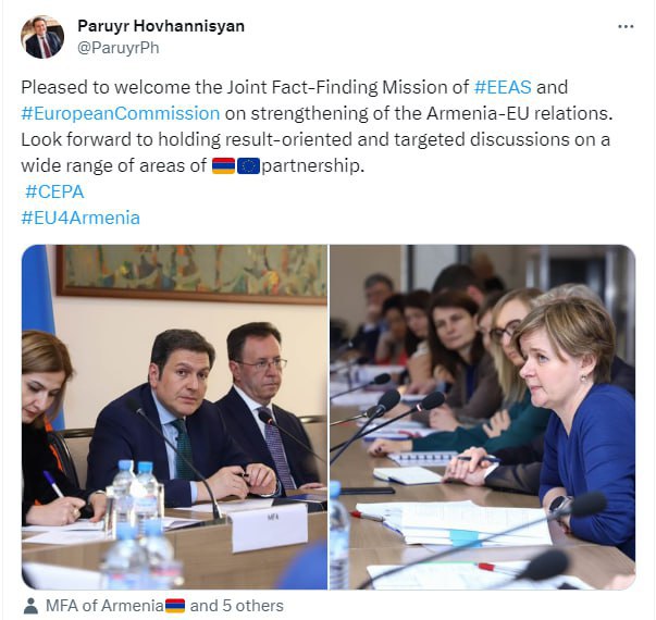 ՀՀ ԱԳ փոխնախարար Պարույր Հովհաննիսյանը թվիթերյան էջում անդրադարձել է եվրոպական պատվիրակության՝ Հայաստան ժամանմանը՝ ողջունելով և հայտարարելով, որ Երևանն ակնկալում է արդյունքների վրա հիմնված քննարկումներ` մի շարք ոլորտներում։