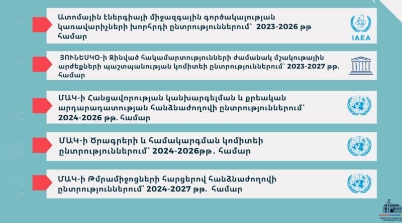 2023 թ. Հայաստանի Հանրապետությունն ընտրվել է բոլոր այն միջազգային կազմակերպություններում, որտեղ առաջադրել է իր թեկնածությունը: Այդ մասին հայտնում են ՀՀ ԱԳՆ-ից: