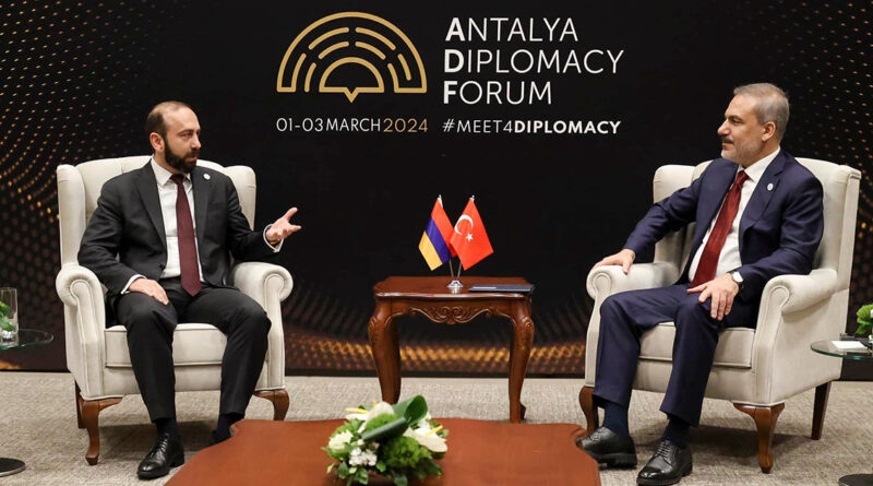 Մարտի 1-ին Անթալիայի դիվանագիտական ֆորումի շրջանակներում Հայաստանի Հանրապետության արտաքին գործերի նախարար Արարատ Միրզոյանը հանդիպում է ունեցել Թուրքիայի Հանրապետության արտաքին գործերի նախարար Հաքան Ֆիդանի հետ: Հանդիպմանը մասնակցել են նաև երկու երկրների միջև հարաբերությունների կարգավորման հարցերով հատուկ ներկայացուցիչները։ Հայտնում են ՀՀ ԱԳՆ-ից։