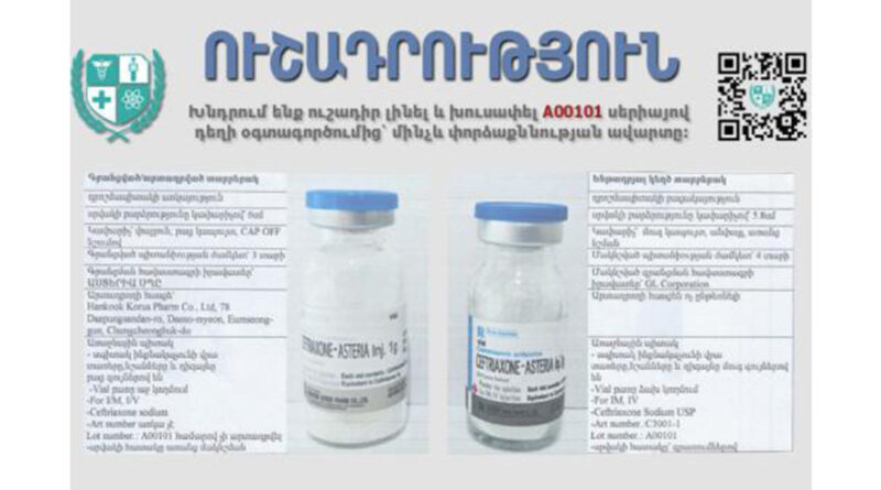 Հարգելի´ քաղաքացիներ, քանի որ առկա է հետկանչի ենթակա առաջին դասի թերության կասկած՝ «Ցեֆտրիաքսոն-Աստերիա Ինջ. 1գ դեղափոշի մ/մ և ն/ե ներարկման լուծույթի A00101 սերիան հնարավոր է կեղծված է, խնդրում ենք ուշադիր լինել և խուսափել տվյալ սերիայով դեղի օգտագործումից՝ մինչև փորձաքննության ավարտը։