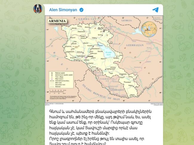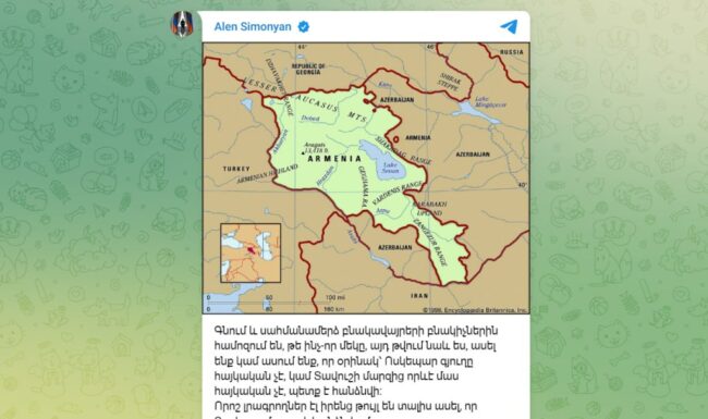 ԱԺ նախագահ Ալեն Սիմոնյանը այսօր՝ ապրիլի 4-ին, իր տելեգրամյան ալիքում հրապարակել էր ՀՀ քարտեզ(բրիտանական հանրագիտարանում 1998 թվականին հրապարակված քարտեզ) ու գրառում արել՝ հայտարարելով, որ ՀՀ ոչ մի տարածք, ոչ մի բնակավայր, ոչ մի գյուղ, ոչ մի մետր չի կարող հանձնվել, ոչ էլ նման քննարկում կա։