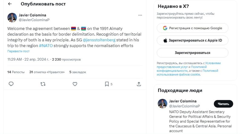 ՆԱՏՕ-ի գլխավոր քարտուղարի հատուկ ներկայացուցիչ Խավիեր Կոլոմինան ողջունում ենք Հայաստանի և Ադրբեջանի միջև Ալմաթայի հռչակագրի ընդունումը որպես սահմանի սահմանազատման հիմք: