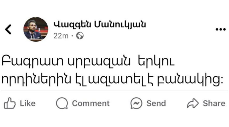 2024թ-ի ապրիլի 30-ին «Facebook» սոցիալական հարթակի անձնական էջում Վազգեն Մանուկյան անունով օգտատիրոջ անձնական հաշվում զետեղվել է «Բագրատ սրբազան երկու որդիներն էլ ազատել է բանակից» բովանդակությամբ գրառում։