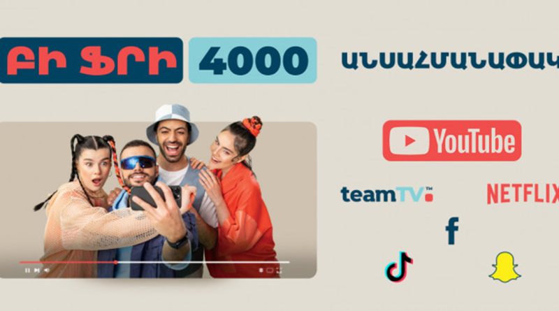 Team Telecom Armenia-ն մշակել է նոր Բի Ֆրի փաթեթ, որը հնարավորություն է տալիս օգտվել հիմնական վիդեո հարթակներից անսահմանափակ՝ առանց ինտերնետի սպառման։ Այս առաջարկն ընգրկում է YouTube, Netflix, Snapchat, TikTok ու այլ թոփ հավելվածներ։ «Բի Ֆրի 4000» փաթեթը ստեղծելիս ընկերությունը հիմնվել է բաժանորդների վարքագծի ուսումնասիրության վրա։