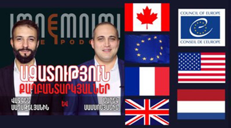 Նշվում է, որ հանրային գործունեությամբ զբաղվող Նարեկ Սամսոնյանն ու Վազգեն Սաղաթելյանը կալանավորվել են միջազգային կառույցների ջանքերով և ճնշման ներքո ապաքրեականացված և այժմ գոյություն չունեցող տխրահռչակ «ծանր վիրավորանքի» հոդվածի հիման վրա, որն իշխանությունները «վերակենդանացրել են» խուլիգանության հանցակացմի ներքո։