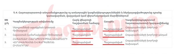 Հայտարարագրի մեկ այլ` ոչ առեւտրային կազմակերպություններում մասնակցության բաժնում ինֆորմացիան փակված է 3 նմանատիպ կառույցների ՀՎՀՀ-ի և հասցեների մասով։