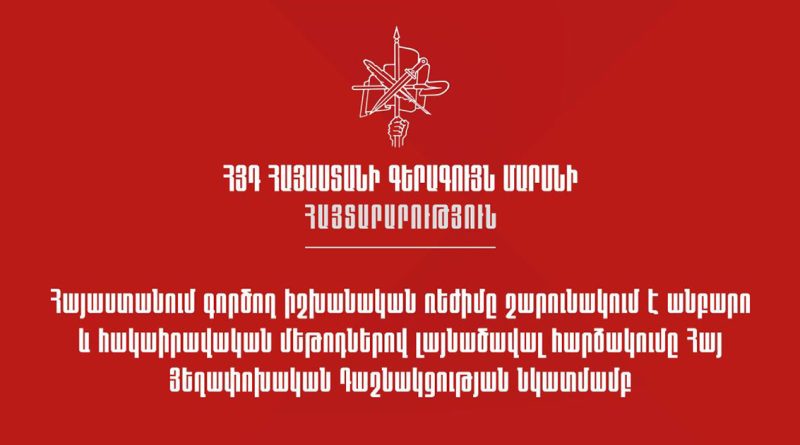 Հայաստանում գործող իշխանական ռեժիմը շարունակում է անբարո և հակաիրավական մեթոդներով լայնածավալ հարձակումը Հայ Յեղափոխական Դաշնակցության նկատմամբ: